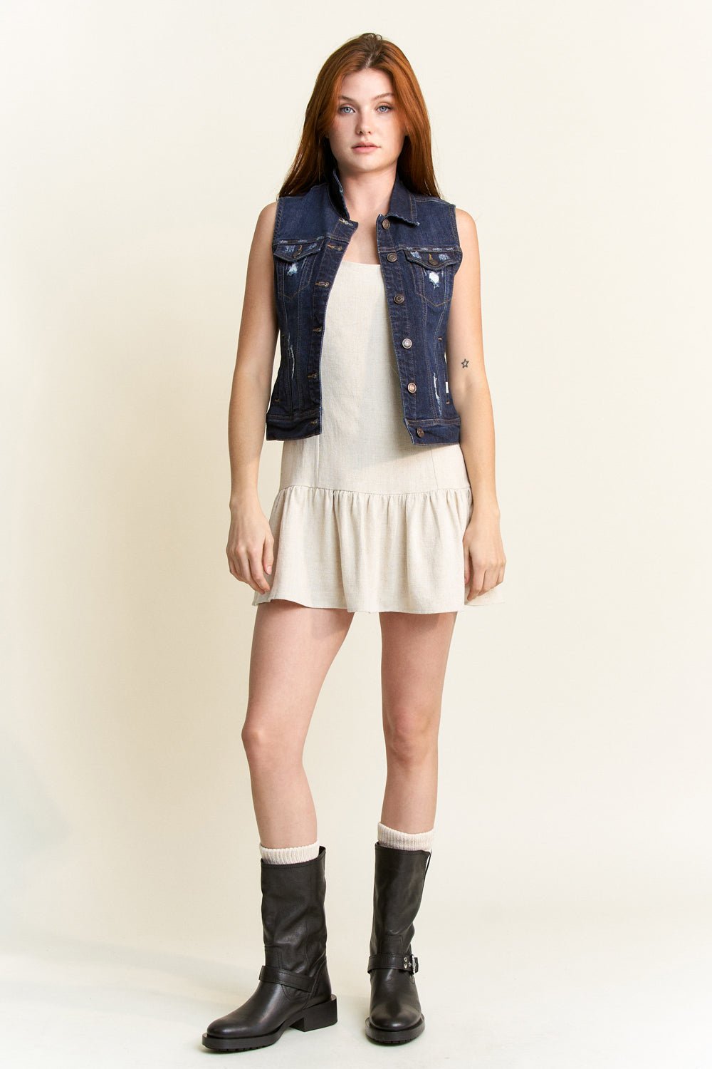 Destructed Denim Vest Stone wash vest with grindings, hand sanding, and with destructions. Features: point collar, chest flap pockets, side welt pockets, button front closure, adjustable back waist tabs. Unlined.