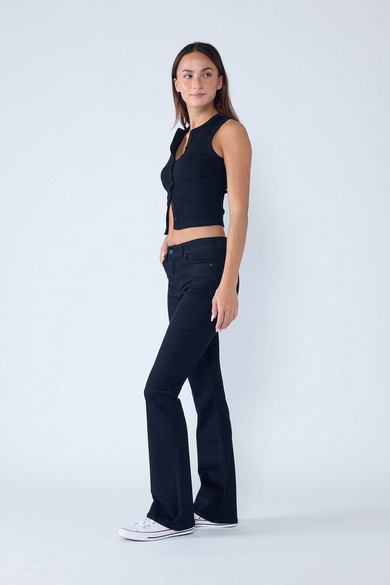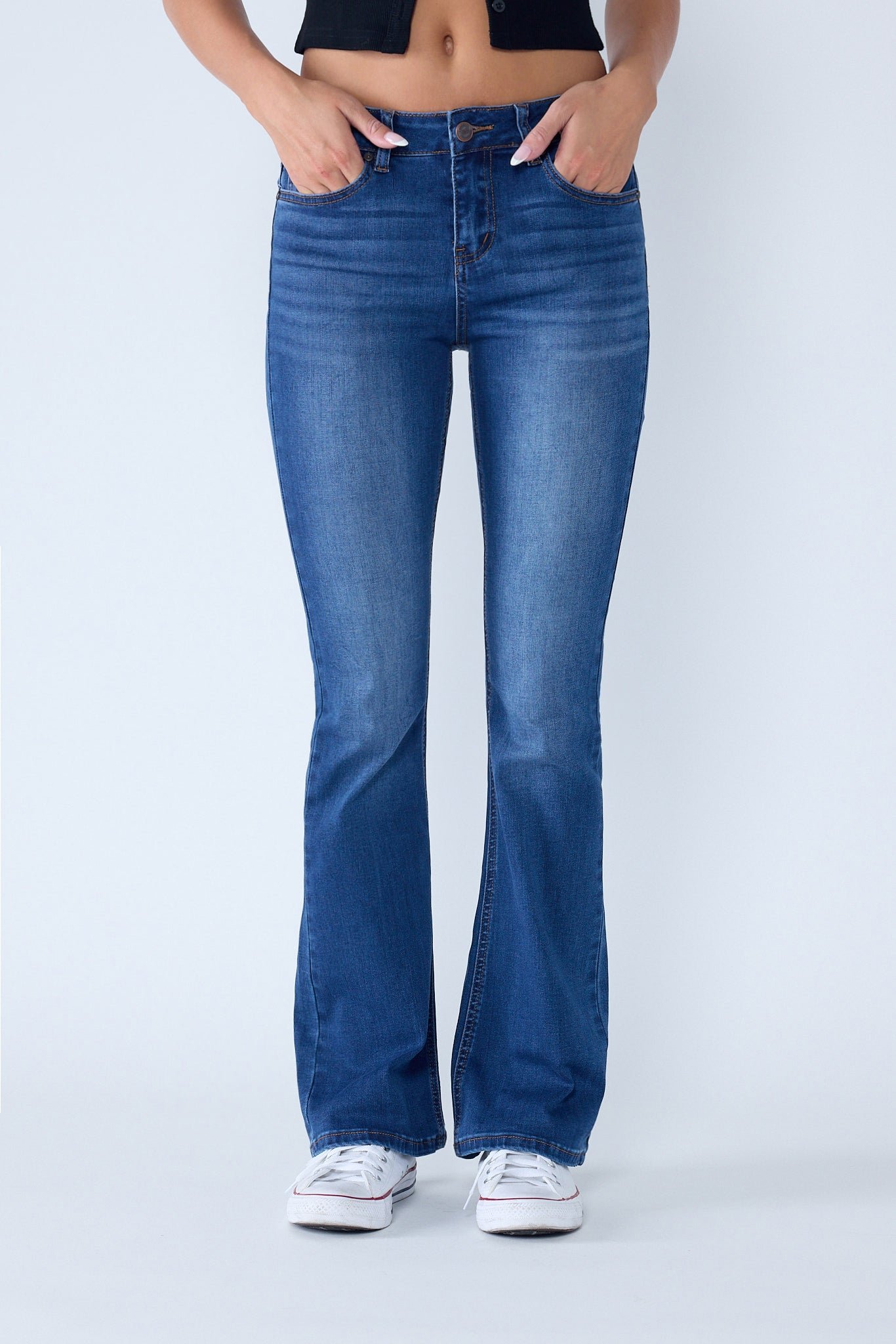 High-rise 5-pocket bootcut jeans with hand sanding, and whiskers.